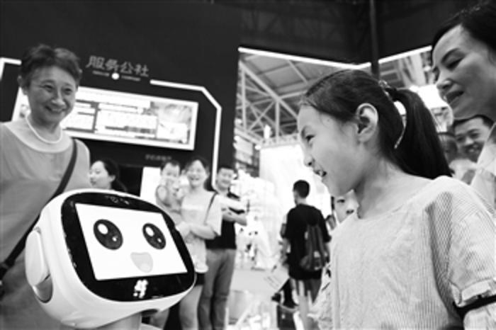 8月27日是2019中国国际智能产业博览会免费对公众开放的第一天,众多市民和游客来到重庆国际博览中心参观体验,感受“智能应用”,体验“智能生活”。图为小朋友在智博会上与智能机器人互动。