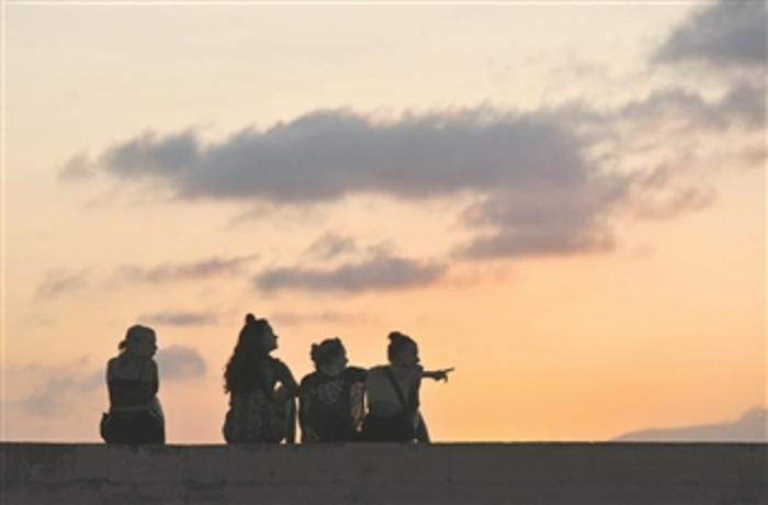 晚霞笼罩下,四名女孩在西班牙阿利坎特市的圣巴巴拉城堡上欣赏风景。