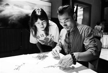 9月1日,在福州朱紫坊,龚富英在用茶渣作画。