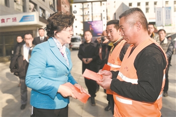 云南省人大常委会副主任、省总工会主席王树芬(左)看望慰问环卫工人。