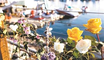 9月2日,在美国加利福尼亚州圣巴巴拉县,海边围栏上摆放着鲜花,悼念游船失火事故遇难者。