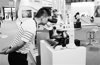9月3日,一名参观者通过显微镜观察由步进投影光刻机制作的图形展示。
