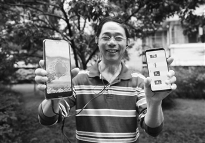 9月6日,杨福根在小区楼下展示自己制作的网络表情。