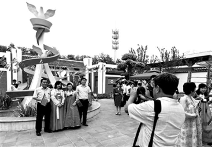 9月9日,游客在北京世园会朝鲜馆前留影。当日,2019年中国北京世界园艺博览会“朝鲜国家日”活动在北京世园会园区举行。新华社记者 李欣 摄