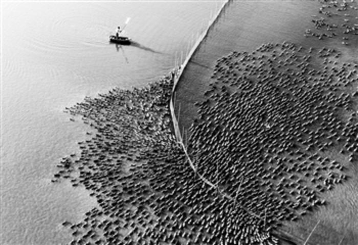 9月9日,安徽省合肥市庐江县白湖镇杨柳水乡,养殖户正在河道里放养鸭子。