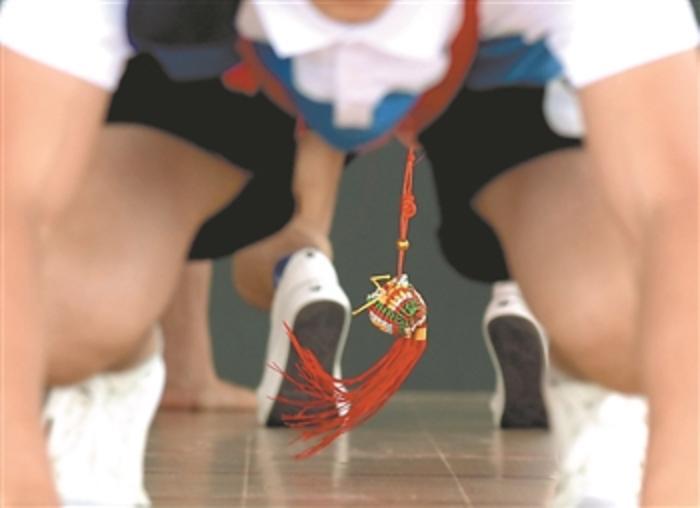9月10日,两名运动员在押加比赛中,坠条在决胜线上摇摆不定。