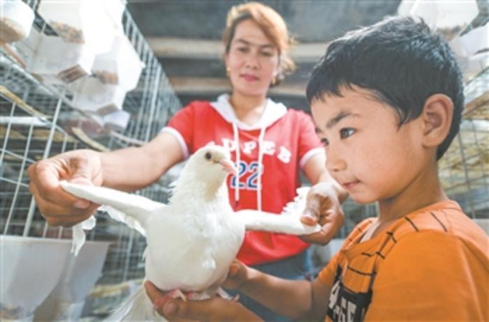 新疆喀什市英吾斯坦乡艾来木巴格村贫困户帕提姑丽·亚森(左)和儿子在自家鸽舍内查看鸽子的健康状况。通过养殖鸽子,帕提姑丽·亚森家如今每个月可增加数千元收入,这个深度贫困的家庭今年年底有望脱贫。