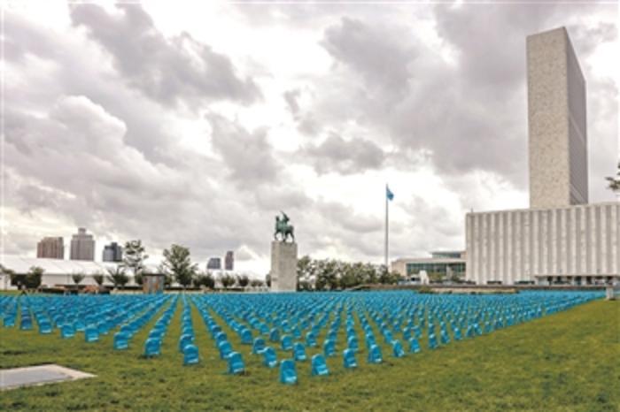 这是9月10日在纽约联合国总部拍摄的联合国儿童基金会制作的装置艺术作品,3758只蓝色书包象征了2018年在世界各冲突地区丧生的儿童。