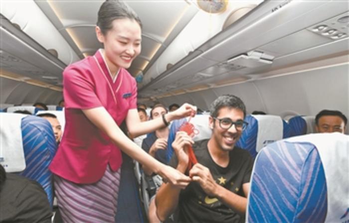 ① 9月13日,CZ3119航班的乘务人员将中国结送给机上的外国乘客。新华社记者 杨冠宇 摄