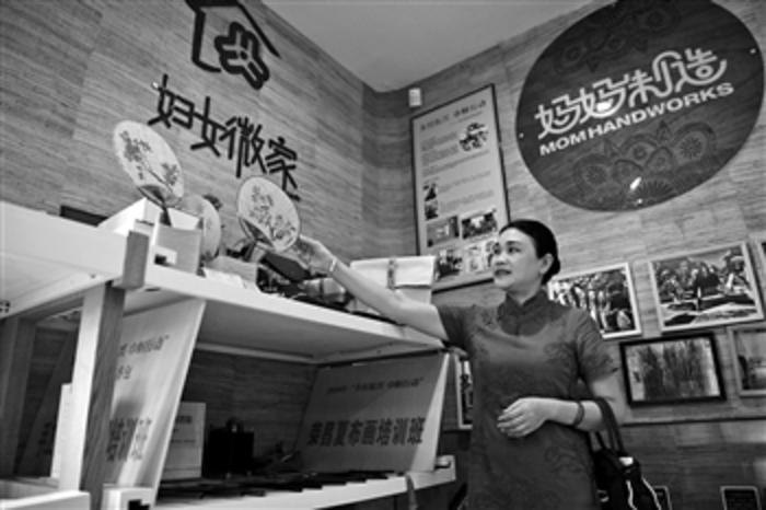 荣昌夏布织造手艺人黄秀英在介绍当地妇女儿童手工制作的夏布创意工艺品(9月11日摄)。
