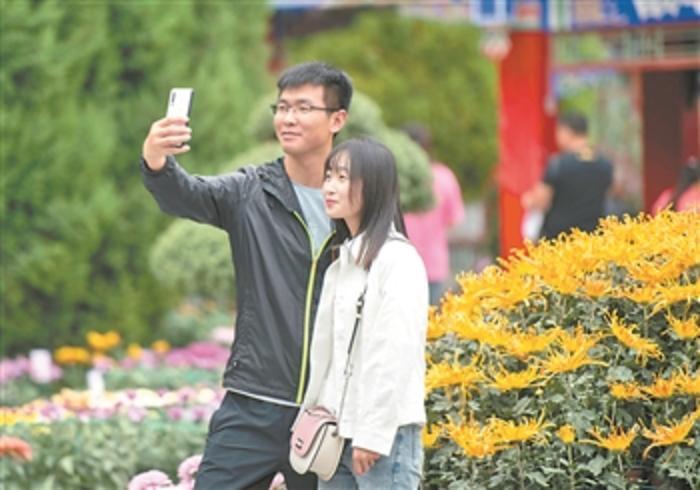 ④ 9月14日中秋假期,游客在银川市中山公园菊花展区自拍。银川市第九届菊花艺术展将于9月15日举行,主要展区的银川市中山公园内的参展花卉已基本布置完毕。新华社发(杨植森 摄)
