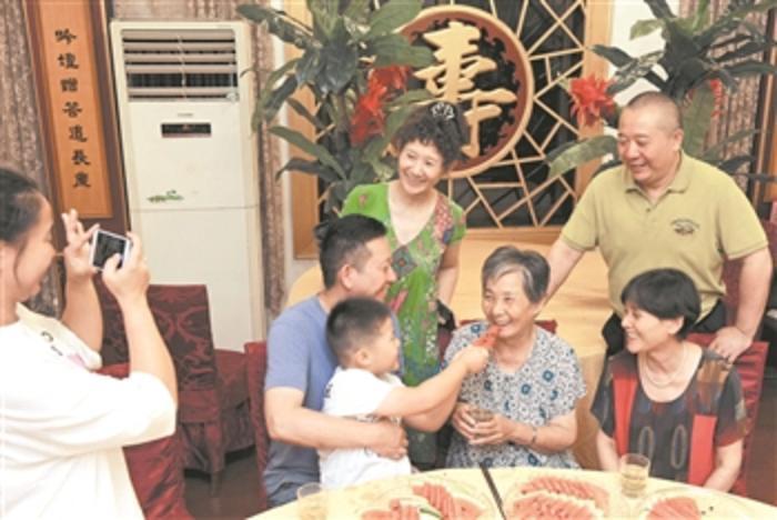 ① 9月13日,中秋节当天,在浙江南浔久安老年城餐厅,84岁的沈学安老人(前右二)和前来看望她的亲人欢聚。 新华社记者 谭进 摄