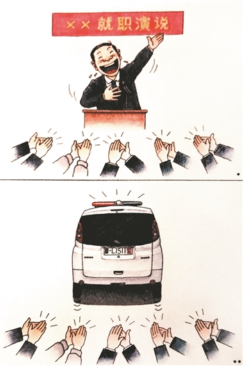 不知过了多久,可以肯定的是,这位某官没有干完一个任期,他就走了。显而易见,他走得不是很情愿,而是被警车“请”走的。“欢送”他的队伍里,又一次爆发了经久不息的掌声,这是这幅作品表现的去“声”。