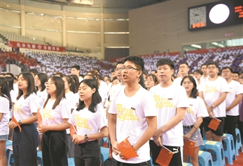 图为新生在南开大学研究生开学典礼上重温张伯苓老校长发出的“爱国三问””——你是中国人吗?你爱中国吗?你愿意中国好吗?“愿祖国繁荣富强!”全体新生的回答响亮而坚定。