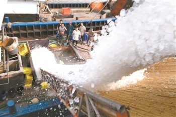 9月15日,停泊在莼湖街道桐照码头的渔船装载用于保鲜的冰块,即将在正式开渔后出海。