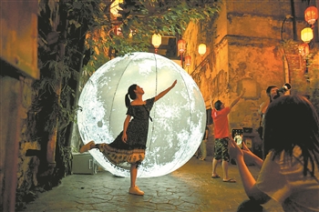 9月13日,在马来西亚吉隆坡,市民在月亮模型气球前拍照留念。