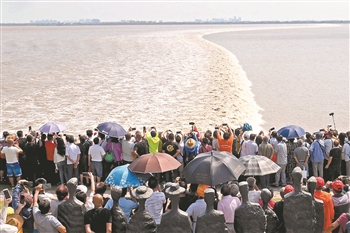 9月16日是农历八月十八,号称“天下第一潮”的钱塘江大潮汹涌而来,来自全国各地的观潮客在钱塘江边一睹大潮盛况。由于今夏雨水量大,钱塘江河床隆起的泥沙堆被冲刷,使得今年的秋潮更加壮观。 王芯克 摄