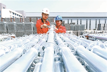 9月16日,由北京转移到乐亭县经济开发区的华北易安德脚手架制造有限公司的工人在检验产品质量。