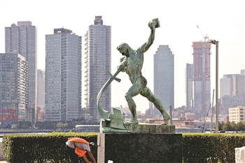 这是9月11日在位于纽约的联合国总部拍摄的雕塑“铸剑为犁”。