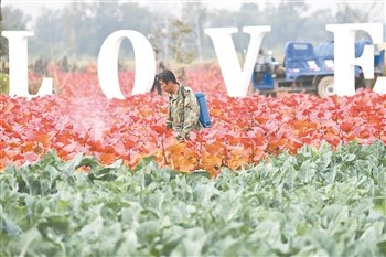 9月17日,村民在山西省太原市晋源区花卉小镇庞家寨村示范区内喷洒农药。