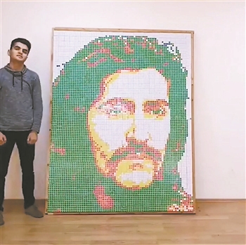 22岁的阿塞拜疆小哥哈扎特可以用魔方作画。他先把魔方调整为想要的颜色,然后将其一个个叠加拼凑出众多马赛克一样的人物肖像,每个月最多能制作14幅肖像画。东方IC供图