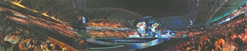 在全场有节奏的呐喊声中,他身披国旗跳上最高领奖台,随后又奔跑着进入舞台一侧的“冠军圈”。