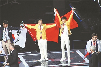 ③移动机器人项目冠军胡耿军(右)、郑棋元站上最高领奖台。这是中国代表队首次获得该项目金牌。 孙兴伟 摄