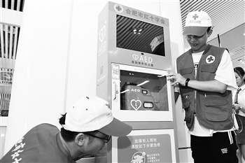近日,在合肥市地铁1号线合肥南站站厅内,志愿者在准备即将投入使用的AED急救设备。