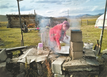 9月8日,一位哈萨克族女子正在烧牛奶,制作奶疙瘩。