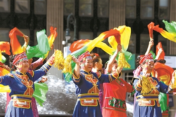 当日,美国纽约及周边地区数百名华侨华人以快闪方式展示中国民族服装,载歌载舞迎接国庆节。