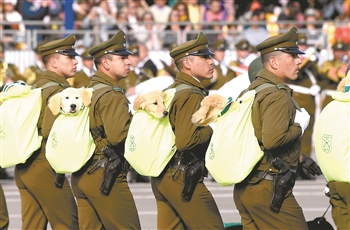 9月19日,一年一度的智利陆军节阅兵式在首都圣地亚哥奥希金斯公园举行。图为宪兵身背警犬幼犬在阅兵式上行进。