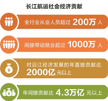 长江航运,不仅改变了船员个体的生存状况,更深刻影响了中国经济的发展版图。据统计,长江经济带11个省市集聚了我国45%的经济总量;近一半的全国500强企业分布在沿江两岸;沿江经济社会发展所需85%的铁矿石、83%的电煤和85%的外贸货物运输量(中上游地区达90%)主要依靠长江航运来运输;长江航运每年对沿江经济发展的直接贡献达2000亿元以上,间接贡献达4.3万亿元以上。