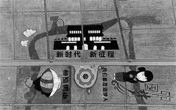 9月21日,黑龙江省佳木斯市北大荒富锦市万亩水稻公园,农场工作人员用种植的稻田画喜迎新中国成立70周年。