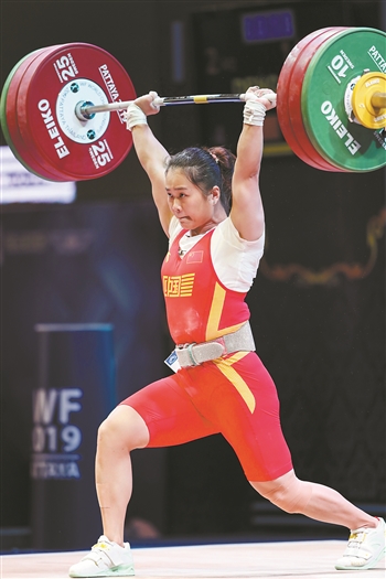 9月22日,在泰国芭提雅举行的2019世界举重锦标赛女子64公斤级比赛中,中国选手邓薇以抓举116公斤、挺举145公斤和总成绩261公斤轻松包揽三冠,同时打破了三项世界纪录。图为中国选手邓薇在挺举比赛中。新华社记者 张可任 摄