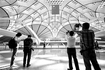 9月25日,北京大兴国际机场,乘坐国航CA9597航班的旅客在航站楼大厅拍照留影。随着首个商业载客航班的起飞,北京进入双枢纽机场时代。