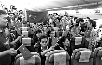 9月25日,在北京飞往成都的航班上,来自国航的劳模、先进工作者、职工代表和旅客在万米高空一起歌唱祖国,抒发爱国热情,庆祝新中国70华诞。本报记者 王伟伟 摄