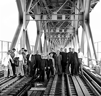 ◀1957年初,铁路钢梁合龙后、公路桥面还未合龙时,武汉长江大桥技术委员会部分成员在大桥上留影。