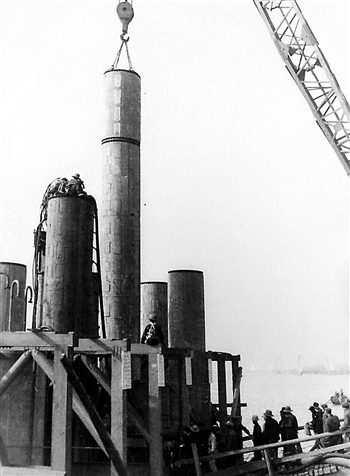 ▲武汉长江大桥采用大型管柱钻孔法,开创了桥梁建设新篇章。图为管柱的下沉。