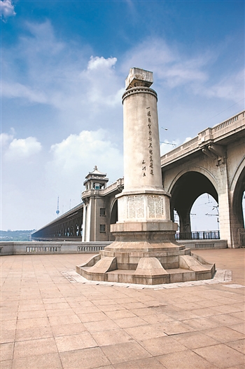 ▲2009年8月27日拍摄的武汉长江大桥东南侧的建成纪念碑。 视觉中国供图