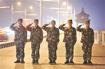 ◀2016年11月29日晚,武汉长江大桥5位即将退役的“守桥兵”,在最后一次值夜班结束后,在长江大桥上合影留念。