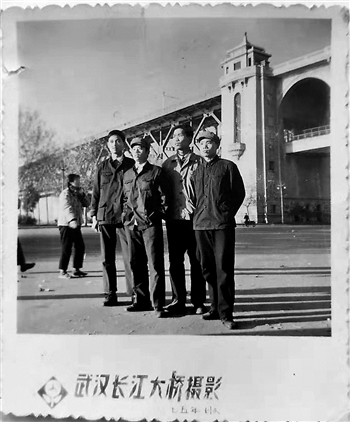 ▲1975年,湖北冶金系统青工与前来学习的安徽冶金系统青工在武汉长江大桥下合影。 张翀 供图