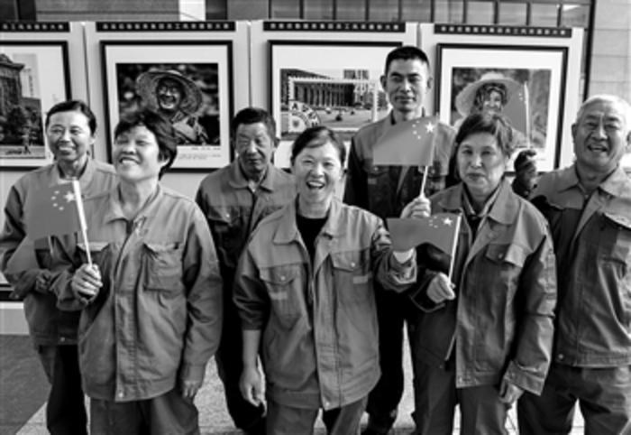 9月30日,几位后勤保洁人员在有自己形象的照片前留影。