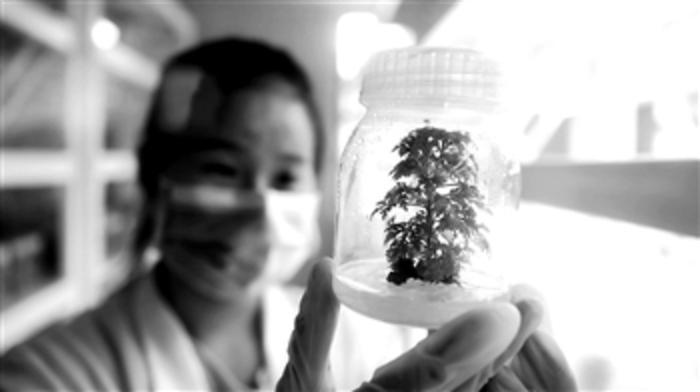 9月29日,广西融安一家青蒿素提炼加工企业的工作人员在实验室培育青蒿苗。