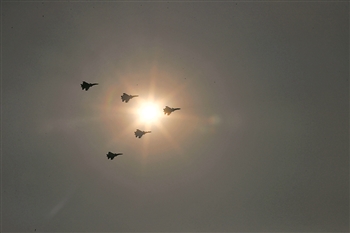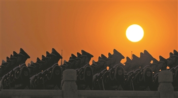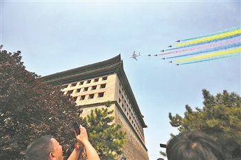 10月1日上午,机群从北京东便门明城墙遗址公园东南城墙角楼飞过。