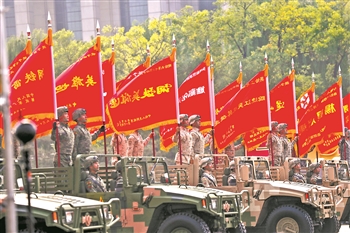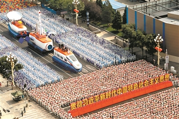 群众游行活动中的“创新驱动”方阵,以彩车、模型的形式展现当下中国科技领域取得的重大成果。