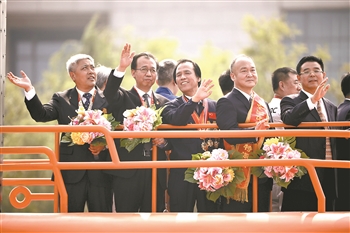 10月1日,国庆彩车游行中,全国劳动模范、大国工匠高凤林(左三)向观众挥手。