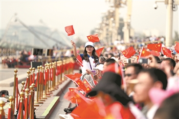 ③10月1日,在国庆阅兵观礼台上,来自北京师范大学的志愿者张鸿儒与观众一起挥旗欢呼。在每个观礼台上都有多个志愿者为观众提供问询、引导等服务。本报记者 王伟伟 摄