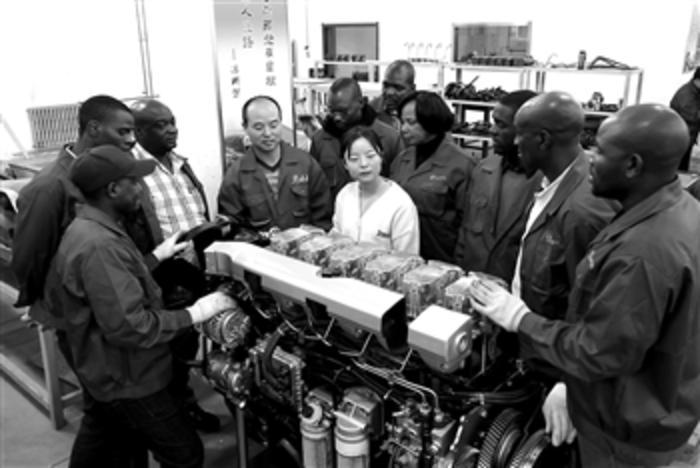 10月9日,在西安陕汽控股集团有限责任公司陕西汽车技工学校重卡技术实训基地,汽车技术实操老师陈立龙正在给来自非洲赞比亚的学员讲授汽车发动机原理和各部件功能、维修保养等相关知识和技能。谭永平 摄