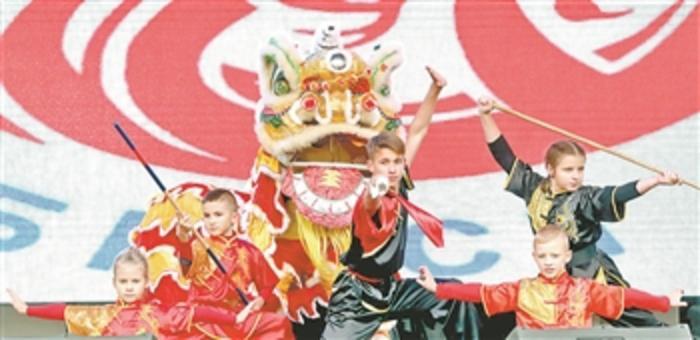 白俄罗斯首都明斯克,当地青少年在“孔子学院日”活动上表演武术。