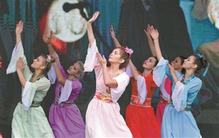 白俄罗斯首都明斯克,当地学生在“孔子学院日”活动上表演舞蹈。